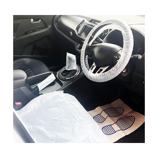 Kit includes: 1 x Disposable car seat cover, 1 x Disposable elasticated steering wheel cover, 1 x Disposable paper floor mat, 1 x Disposable gear stick cover, 1 x Disposable hand brake cover