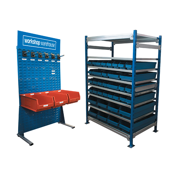 Racking unit comes with: 8 Shelves (600 x 970 mm), 22 Bins (600 x 120 x 95 mm), 8 Bins (600 x 240 x 150 mm), 5 Bins (600 x 240 x 95 mm) – all bins come with dividers.