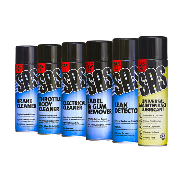 6 x 500ml Aerosols: Brake Cleaner, Throttle Body Cleaner, Electrical Cleaner, Label & Gum Remover, Leak Detector, Universal Maintenance Lubricant.