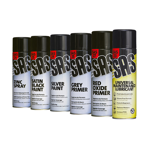 6 x 500ml Aerosols: Zinc Spray, Satin Black Paint, Silver Paint, Grey Primer, Red Oxide Primer, Universal Maintenance Lubricant.